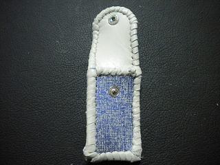 表面の正面側は、横ラインの溝のあるデザインを型押しをした、ホワイトレザーを使用しています。 表面の蓋から後ろ側にかけては、ブラウンパンチングレザー(穴貫通)を使用しています。 内側は、パール発色のあるスカイブルーのレザーを使用しています。 ケース周囲は、ライトベージュのレザーで、かがり仕上げをしています。 |