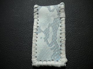 表面の正面側は、ホワイトをベースに、ブルーカラーで、デジタルノイズのようなデザインを表現したレザーを使用しています。 表面の蓋から、後ろ側にかけては、ブルースネークのデザインを型押しをした、レザーを使用しています。 内側とケース周囲のかがりは、ホワイトグレーのレザーを使用して、仕上げました。 |