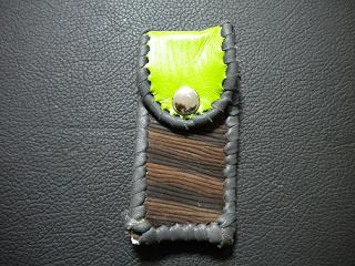 表面の正面側は、樹木の樹皮のようなデザインの型押しブラウンレザーを使用。 表面の蓋から、後ろ側にかけては、グリーンレザーを使用しています。 ケース内側は、ホワイトレザーを使用。 ケース周囲は、グレーレザーで、かがりをして、仕上げました。 |