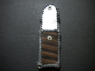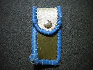 表面の正面側は、ブルースネークデザインのレザーを使用しました。 表面の蓋から、後ろ側にかけては、ブラックメタルカラーのレザーを使用しています。 ケースの内側は、ホワイトグレーのレザーを使用しました。 ケース周囲は、縦ラインをホワイトグレーのレザー、横ラインをブラックレザーで、かがりをして仕上げました。 |