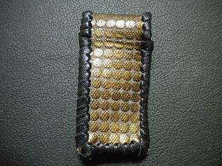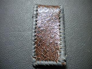 表面は、ブラウンレザーに、ブラウンとゴールドのウエーブラインをデザインしたレザーを使用しました。 内側は、ピンクのカラーを刷毛目を出して、まだらに染めたようなデザインのレザーを使用しています。 ケース周囲は、ゴールドレザーで、かがり仕上げをしています。 |