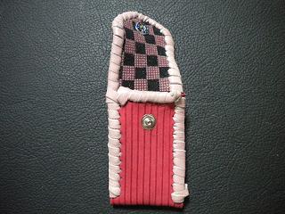表面は、等間隔に、溝の型押しをした、バックスキン調のレッドレザーを使用しました。 内側は、ブラックの四角とワインレッドのクロスラインで、チェック柄を表現したスエードレザーを使用。 ケース周囲は、ピンクレザーで、かがりをして、仕上げました。 |