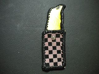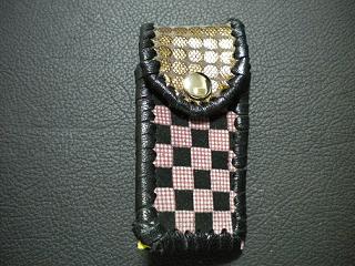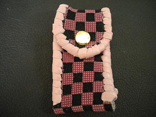 表面は、ブラックの四角とワインレッドのクロスラインで、チェック柄を表現したスエードレザーを使用。 内側は、ライトグレーパンチングレザーを使用しています。 ケース周囲は、ピンクレザーで、かがりをして、仕上げました。 |