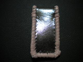 表面は、ピンクメタリックレザーを使用しています。 内側は、ライトグレーパンチングレザーを使用しました。 周囲の部分は、グレーレザーで、かがりをして仕上げました。 |