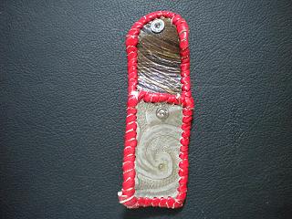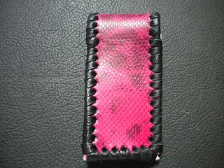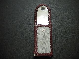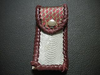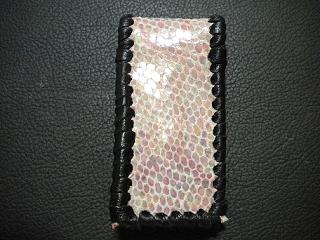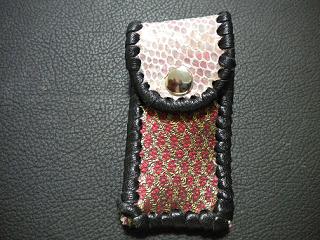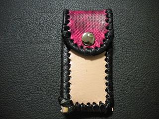 表面の正面側は、ライトピンクレザーを使用。 表面の蓋から、後ろ側にかけては、レッドスネークの型押しレザーを使用しています。 ケース内側は、パールホワイトレザーを使用。 ケース周囲は、ブラックレザーで、かがり仕上げをしました。 |