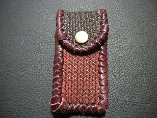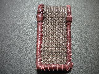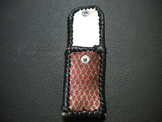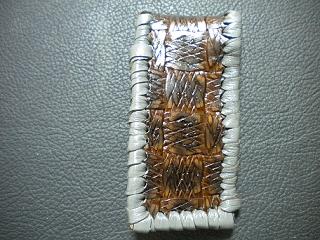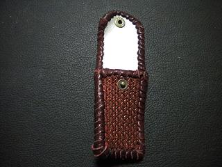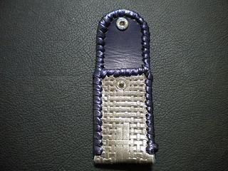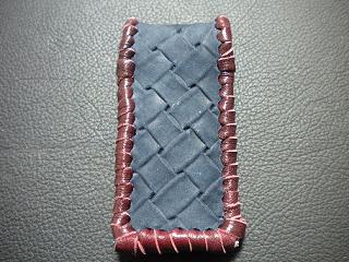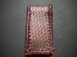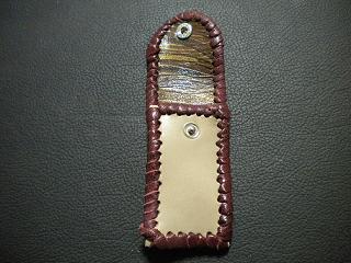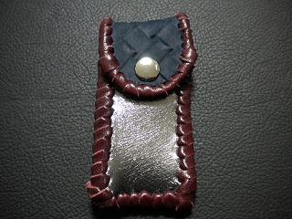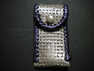 表面は、編み込みデザイン型押しのメタリックローズブラウンレザーを使用。 内側は、濃いパープルレザーを使用しました。 ケース周囲は、メタリックパークレザーで、かがり仕上げをしました。 |