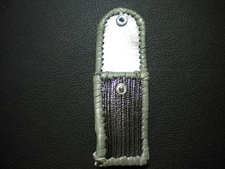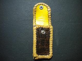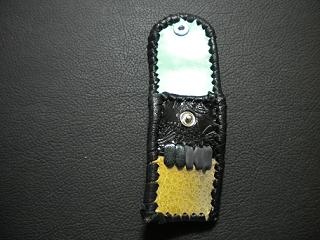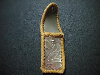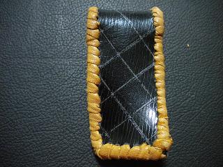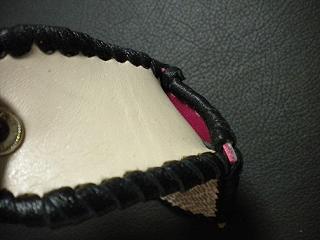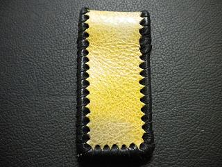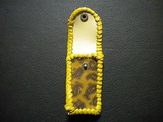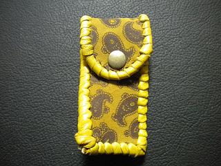表面は、モカの色合いのバックスキン調レザーに、ペイズリーのプリントを施した、レザーを使用しています。 内側は、クリームレザーを使用しました。 周囲の部分は、イエローレザーで、かがり仕上げをしました。 |