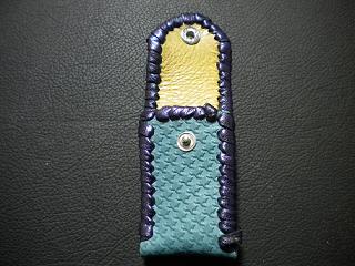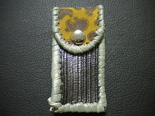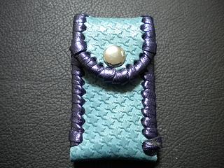 表面は、ハウンドトゥース柄を型押した、ミントブルーのレザーを使用しています。 内側は、和紙のような表面デザインのレザーを使用しています。 ケース周囲は、パープルメタリックレザーを使用して、かがり仕上げをしました。 |