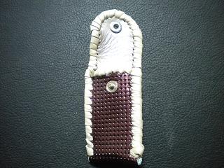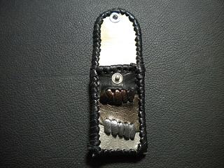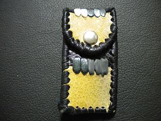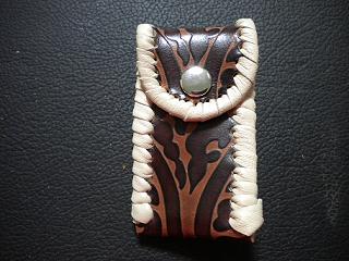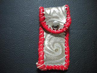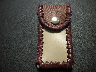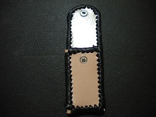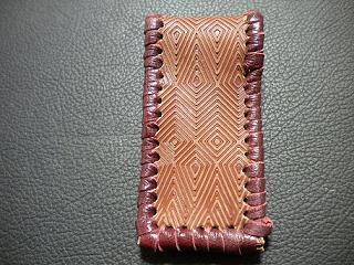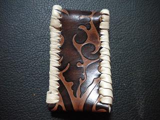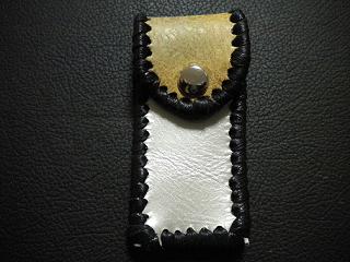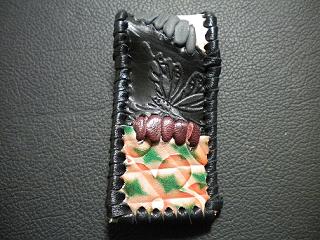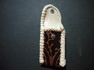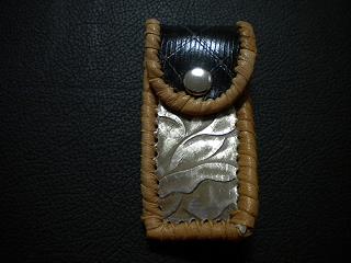 表面は、ウエスタン調リーフデザイン型押しレザーを使用。 内側と周囲のかがりは、パールアイボリーレザーを使用して仕上げました。 |