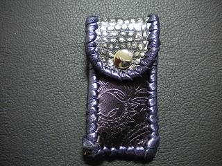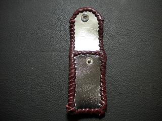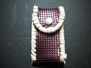 表面は、サークルデザイン型押しのグレープメタリックレザーを使用しています。 内側は、ピンクメタリックレザーを使用しました。 ケース周囲は、パールアイボリーレザーで、かがり仕上げをしました。 |
