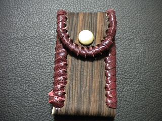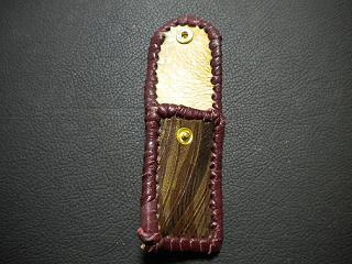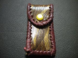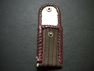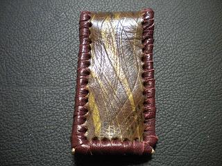 表面は、樹木の表皮のようなデザインのレザーを使用しました。 内側は、クリームレザーを使用。 ケース周囲は、マルーンレザーを使用して、かがり仕上げをしました。 |