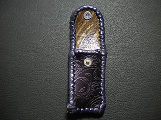 表面の正面側は、草木のデザインを型押した、パープルメタリックレザーを使用。 表面の蓋から後ろ側にかけては、クロコ柄型押しのシルバーレザーを使用しました。 ケース内側は、ブラウンレザーをベースに、ゴールドとブラックのウェーブデザインをプリントしたものを使用しています。 ケース周囲は、パープルメタリックレザーで、かがり仕上げをしました。 |