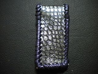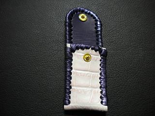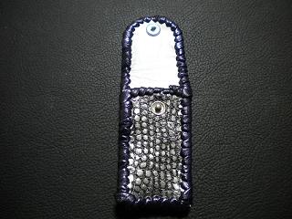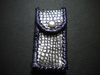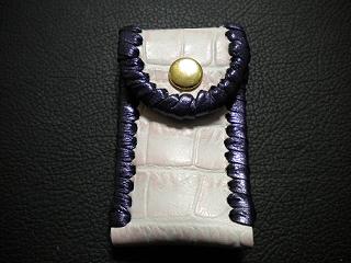 表面は、クロコ柄型押しのシルバーレザーを使用。 内側は、ホワイトレザーを使用しています。 ケース周囲は、パープルメタリックレザーで、かがり仕上げをしています。 |