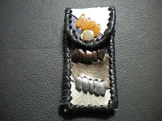レザーパーツ端部をレザーでかがり、パッチワーク調につないでいます。 表面の正面側は、和紙のようなデザインレザーと蝶型押しブラックレザーを使用しています。 2つのレザーは、グレーとグリーンメタリックレザーをつないだもので、かがりをしてつなげています。 表面の蓋から、後ろ側にかけては、和紙のようなデザインレザー、パープルのシルバードットプリント、レザー、メタルシルバーレザー、蝶型押しのブラックレザーを使用しています。 各パーツのつなぎは、グレーメタリック+アイボリー、グレーメタリック+パープル、ブラック+アイボリー、ブラック+ガンメタリックです。 ケース内側は、ミントグリーンレザーを使用しています。 ケース周囲は、ブラックレザーで、かがり仕上げをしています。 |
