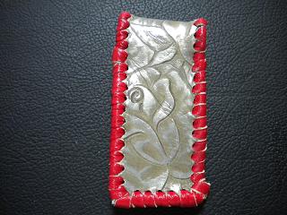 表面は、薔薇のデザインを型押したぼかしシルバーレザーを使用しています。 内側は、ブラウンレザーに、ブラックとゴールドのウェーブラインをプリント加工したものを使用しています。 ケース周囲は、レッドレザーを使用して、かがり仕上げをしました。 |