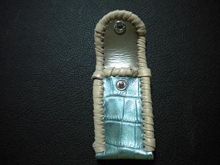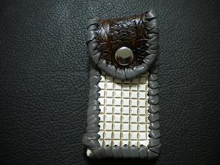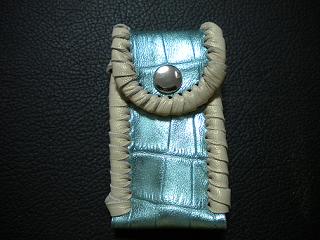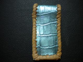 表面は、クロコ柄型押しのブルーメタリックレザーを使用。 内側は、ブロンズメタリックレザーを使用。 ケース周囲は、パールアイボリーレザーで、かがり仕上げをしました。 |