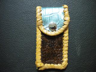 表面の正面側は、ニス塗りの籐細工のような編み込みデザイン型押しレザーを使用しています。 表面の蓋から、後ろ側にかけては、クロコ柄型押しのブルーメタリックレザーを使用。 ケース内側は、イエローレザーを使用しました。 ケース周囲は、ホイートのレザーで、かがり仕上げをしました。 |