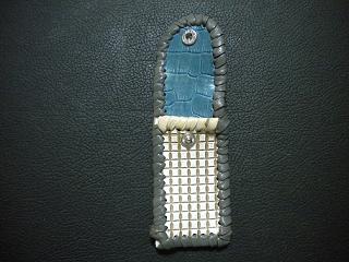 表面の正面側は、5mmの升目を型押した、ホワイトレザーを使用しています。 升目のラインは、ゴ―ルドカラーです。 表面の蓋から、後ろ側にかけては、ニス塗りの籐細工のようなデザイン型押しレザーを使用しています。 ケース内側は、クロコ柄型押しのブルーレザーを使用しています。 ケース周囲は、グレーレザーとクリームレザーを使用して、かがり仕上げをしました。 |