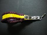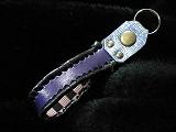 | 説明 | サイズは、長さは約10センチ、幅2センチです。 本体表面は、濃いパープルカラーのレザーを使用しています。 本体内側は、赤と黒のチェックデザインのスエードレザーを使用しました。 本体の端部に、ブルーのデジタルノイズデザインのレザーをかしめ打ちをして、固定しています。 本体の周囲は、ブラックレザーで、かがり仕上げをしました。 |