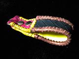 サイズは、長さ約14センチ、先端の幅1センチ、輪の端部幅2.5センチです。 表面の輪の部分は、編み込みデザイン型押しのイエローレザーを使用。 輪の部分の内側は、円形を型押したグレープメタリックレザーを使用。 トップの部分は、編み込みデザイン型押しのメタリックリーズメタリックレザーを使用しています。 周囲の部分は、グレープメタリックレザーで、かがり仕上げをしました。 |