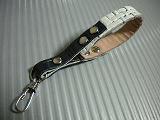 サイズは、長さは約8センチ、幅1センチです。 本体パーツの端部に、レザーパーツをかしめ打ちし、キーフックを固定しています。 輪の部分の表面は、立体感のある編み込みデザインを型押した、ホワイトレザーを使用。 内側は、ライトピンクレザーを使用しています。 トップの部分は、ステッチを入れたようなデザインを型押した、ダークブルーのエナメルです。 内側は、光沢感のあるブロンズカラーのレザーを使用しています。 |