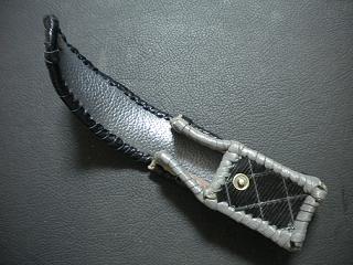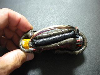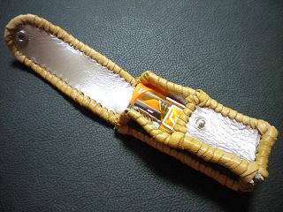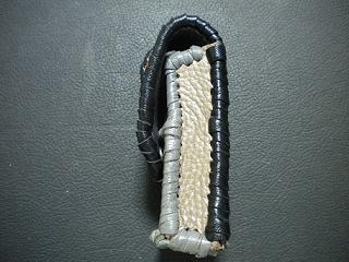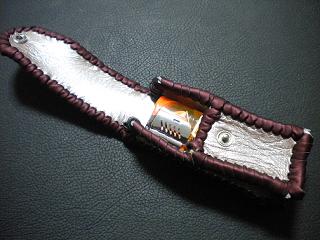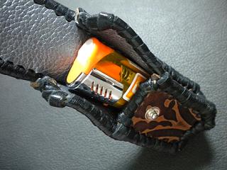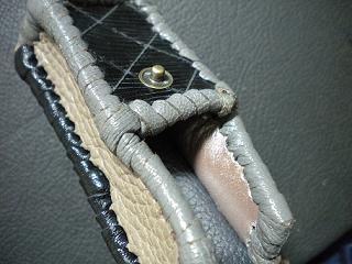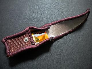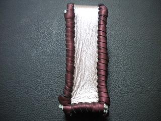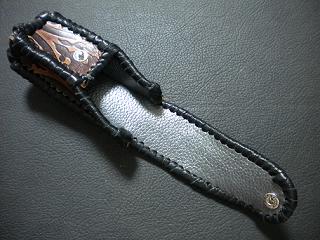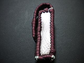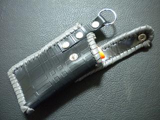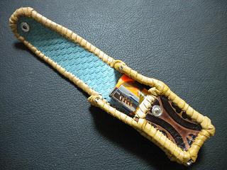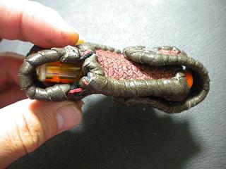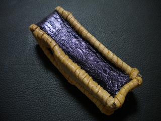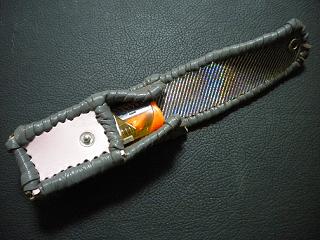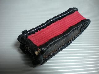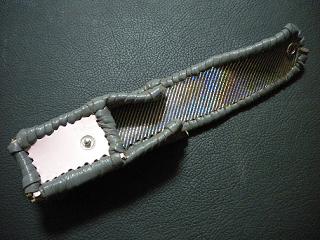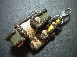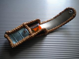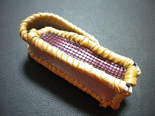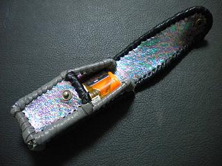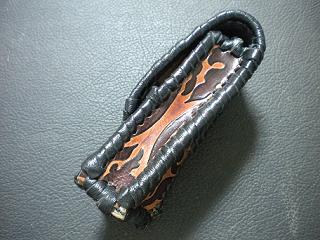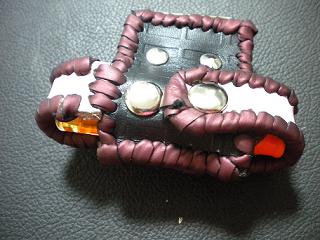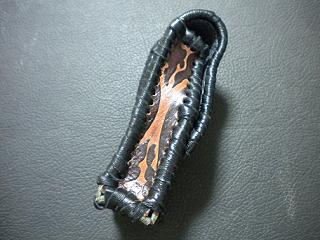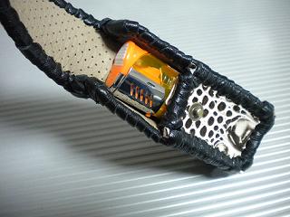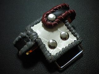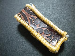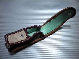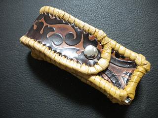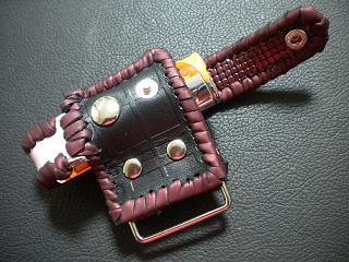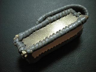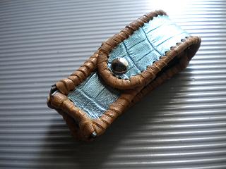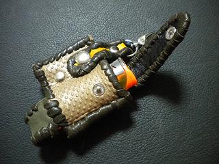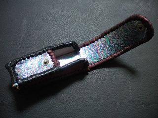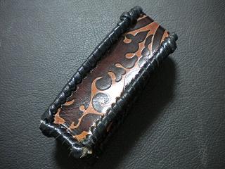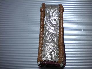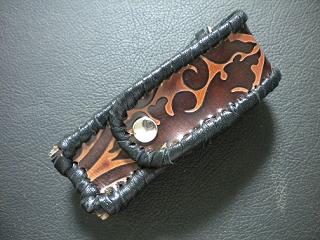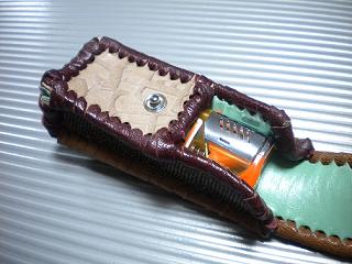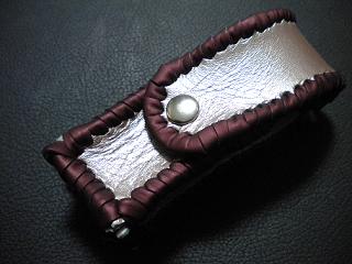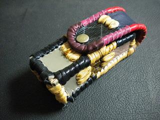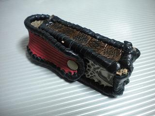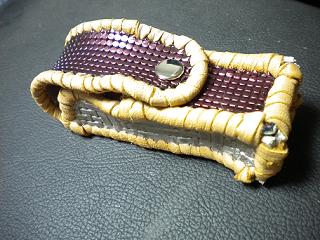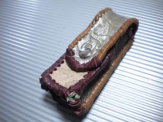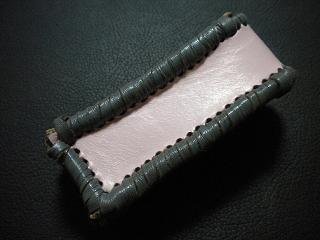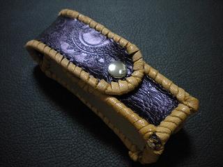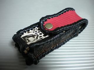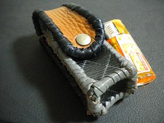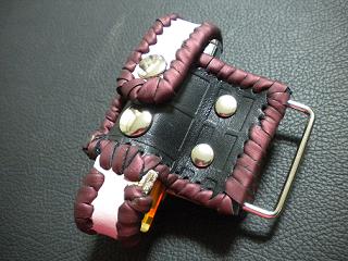 100円ライター用のケースです。 ケースに、角管を付けています。 サイズは、10センチ×8センチ。(ベルトを止めた状態での端部) ケース表面は、ホワイトクロコ柄型押しレザーを使用。 内側は、ブラックレザーを使用しています。 上下ベルト表面と下部ベルト内側は、ブラックレザーに、植物柄を型押したものを使用。 上部ベルト内側と角管固定部分は、ピンクレザーを使用しています。 ケース周囲は、グレーレザーとダークレッドレザーを使用して、かがり仕上げをしました。 |