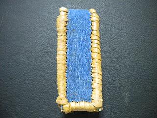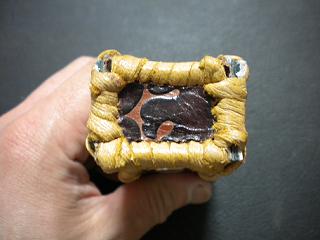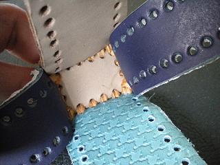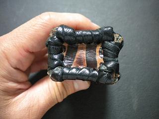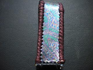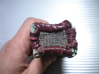 100円ライター用のケースです。 サイズは、縦3センチ、横4センチ、高さ11センチです。 ケース表面は、カットしたレザーパーツ端部をレザーでかがり、つなげています。 ケース表面の正面側は、ブロンズメタリック、ホワイト系クロコ柄型しレザーを使用しホイートのレザーで、つないでいます。 ケース表面の両側面は、ピンクメタリック、渋茶カラーの編み込み型押し、ブロンズメタリックのレザーをホイートのレザーで、つないでいます。 ケース表面の蓋から、後ろ側にかけては、ブラックベースにクロスデザイン型押し、ダークブルー、ブロンズメタリックのレザーをホイートのレザーで、つないでいます。 ケース表面の底は、ブロンズメタリックのレザーを使用しています。 ケース内側は、メタリックロジーブラウンレザーを使用しました。 ケース周囲は、ブラック、ホイート、レッド、ピンクの入ったレッド、グレープメタリックのレザーをつないで、かがり仕上げをしました。 |