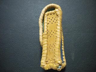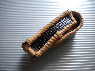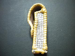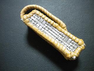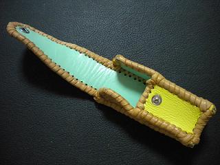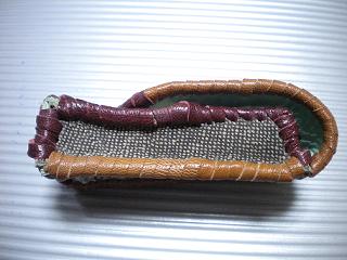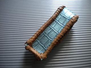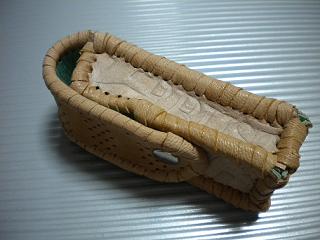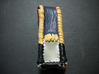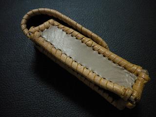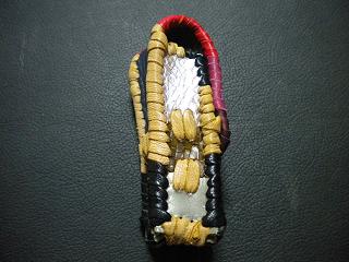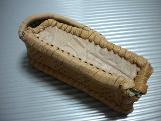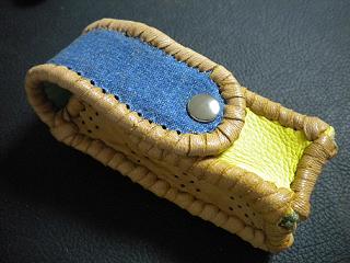 100円ライター用のケースです。 サイズは、縦3センチ、横4センチ、高さ11センチです。 表面の正面側と底の部分は、ホワイト系のクロコ柄型押しレザーを使用しています。 表面の両側面は、ニス塗りの籐細工のような、編み込みデザイン型押しのレザーを使用しています。 表面の蓋から後ろ側にかけては、バックスキン調のレッドレザーで、等間隔に溝を付けた型押しレザーを使用しています。 ケース内側は、ベージュパンチングレザーを使用しました。 ケース周囲は、ブラックレザーで、かがり仕上げをしています。 |