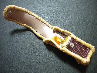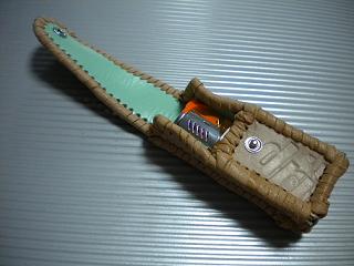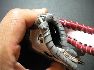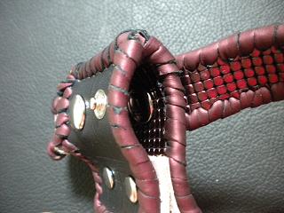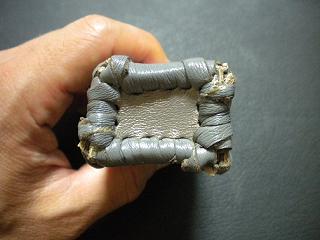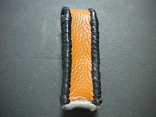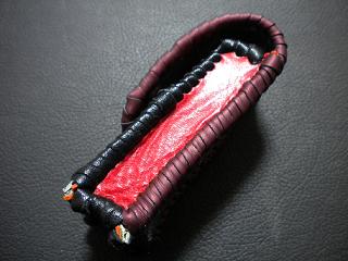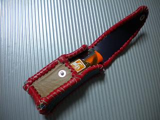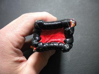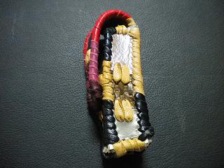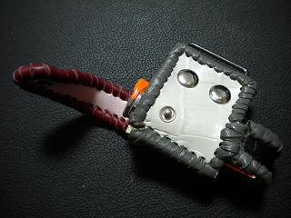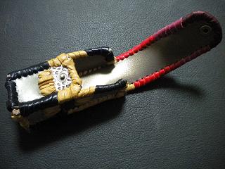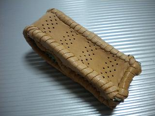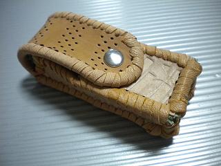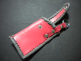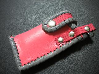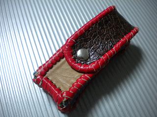 100円ライター用のケースです。 キーホルダーのリングをケースに付けています。 サイズは、10センチ×6センチ(リングの部分を除く本体) 本体表面とベルトの内側は、ライトレッドレザーを使用。 ベルト表面とリング取り付け部分は、等間隔の溝がある型押しレッドレザーを使用しました。 ケース内側は、淡い色合いのゴールドレザーを使用しています。 ケース周囲は、グレーレザーで、かがり仕上げをしました。 |