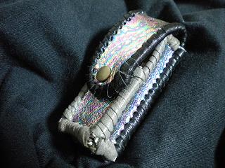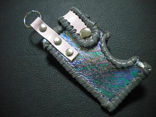 100円ライター用のケースです。 キーホルダーのリングをケースに付けています。 サイズは、10センチ×6センチ(リングの部分を除く本体)。 ケース端部に、円形の切れ込みを入れ、ライターをデザインの一部として見せるようにしています。 ケース表面、ベルトの内側は、シャボン玉の油膜のようなカラーのレザーを使用しています。 ケース内側、ベルト及びリング取り付け部分に、ピンクレザーを使用しています。 ケース周囲は、グレーレザーで、かがり仕上げをしました。 *ライターは、撮影用のため付属しません。 |