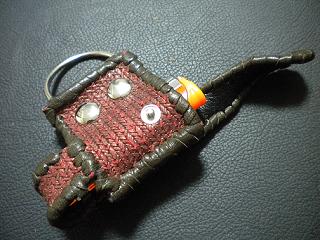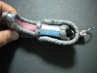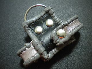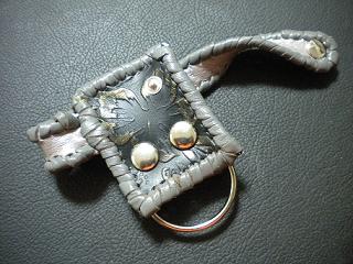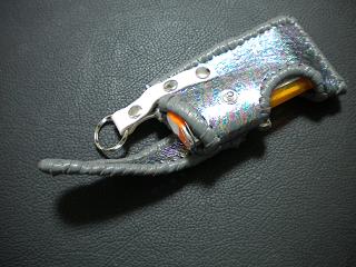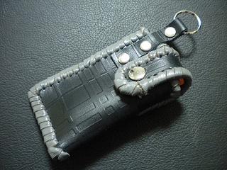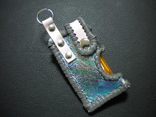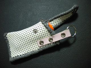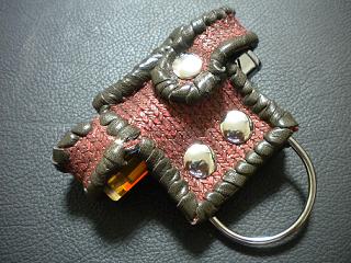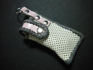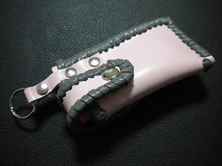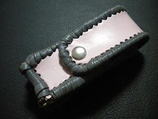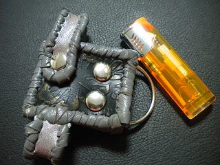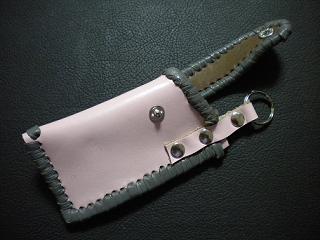 100円ライター用のケースです。 キーホルダーのリングをケースに付けています。 サイズは、10センチ×6センチ(リングの部分を除く本体) 表面は、ピンクレザーを使用。 内側は、ライトブラウンレザーを使用。 ケース周囲は、グレーレザーで、かがり仕上げをしました。 |