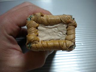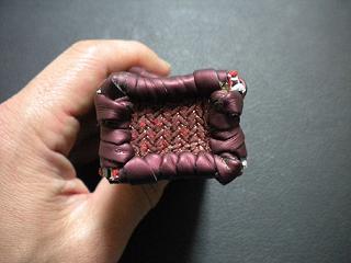 100円ライター用のケースです。 サイズは、縦3センチ、横4センチ、高さ11センチです。 表面の正面側と蓋から後ろ側にかけては、円形デザインを型押した、グレープメタリックレザーを使用。 表面の両側面、底の部分は、編み込みデザインを型押した、メタリックローズブラウンレザーを使用。 ケース内側は、ピンクメタリックレザーを使用しています。 ケース周囲は、ホイートのレザーで、かがり仕上げをしました。 *ライターは、撮影用のため付属しません。 |