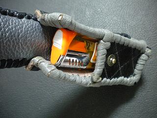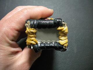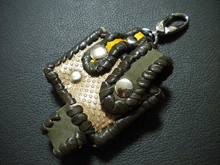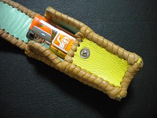 100円ライター用のケースです。 ケースに、フックを付けています。 サイズは、10センチ×8センチ。(ベルトを止めた状態での端部) 本体表面は、ダークゴールドのレザーに、凸ドットを型押したものを使用。 本体内側とフック取り付け部分の表面側が、イエローレザーを使用しました。 ベルト部分の表面は、カーキレザーを使用。 ベルト部分の内側とフック取り付け部分の内側は、ブラックレザーを使用しました。 ケース周囲の部分は、濃いカーキレザーで、かがり仕上げをしました。 *ライターは、撮影用のため付属しません。 |