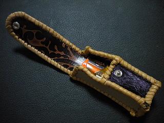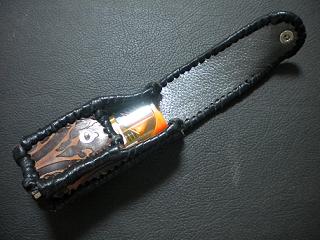 100円ライター用のケースです。 ケースに、D管を付けています。 サイズは、10センチ×8センチ。(ベルトを止めた状態での端部) ケース本体部分表面は、ブラックレザーに、ハイビスカスの花柄を型押したものを使用しています。 ケース本体内側とその他ベルト類などは、パールパープルレザーを使用しています。 ケース周囲の部分は、グレーレザーで、かがり仕上げをしました。 *ライターは、撮影用のため付属しません。 |