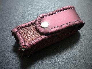 100円ライター用のケースです。 ケースに、D管を付けています。 サイズは、10センチ×8センチ。(ベルトを止めた状態での端部) ケース表面は、編み込みデザインを型押したワインレッドレザーを使用。 ケース内側及びD管取り付け部分やベルトの内側は、ブラックレザーを使用しました。 ケース周囲は、濃いカーキレザーで、かがり仕上げをしました。 *ライターは、撮影用のため付属しません。 |