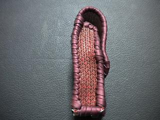 100円ライター用のケースです。 サイズは、縦3センチ、横4センチ、高さ11センチです。 表面の正面側と両側面、底の部分は、編み込みデザイン型押しのカッパーレッドレザーを使用しています。 表面の蓋から後ろ側にかけてとケース周囲のかがりは、深みのあるグレープメタリックレザーを使用。 ケース内側は、ピンクメタリックレザーを使用しています。 *ライターは、撮影用のため付属しません。 |