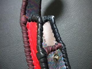 | 商品説明 | 100円ライター用のケースです。 サイズは、縦3センチ、横4センチ、高さ11センチです。 表面の正面側と蓋から後ろ側にかけては、油膜カラーのレザーを使用しています。 表面の両側面と底の部分は、レッドレザーを使用。 ケース内側の正面側、両側面、底の部分は、ピンクメタリックレザーを使用しています。 ケース内側の蓋から後ろ側にかけては、油膜カラーのレザーを使用しています。 ケース周囲は、ブラックレザーとグレープメタリックレザーを使い、かがり仕上げをしました。 |