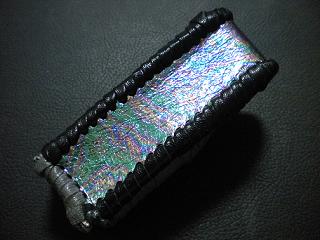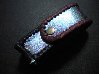 100円ライター用のケースです。 サイズは、縦3センチ、横4センチ、高さ11センチです。 ケース表面、内側ともに、シャボン玉の油膜のようなカラーのレザーを使用しています。 ケース周囲は、グレーレザーとブラックレザーを使用して、かがり仕上げをしました。 *ライターは、撮影用のため付属しません。 |