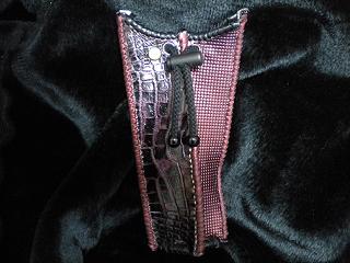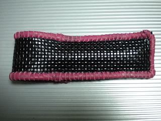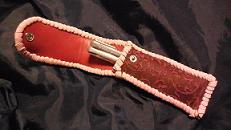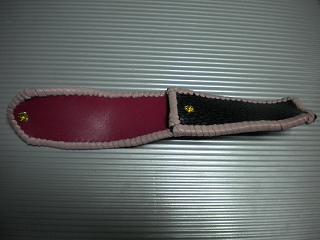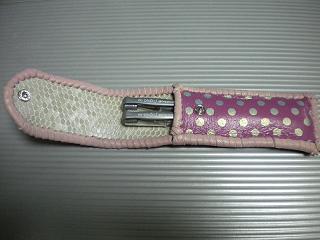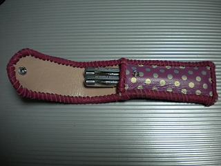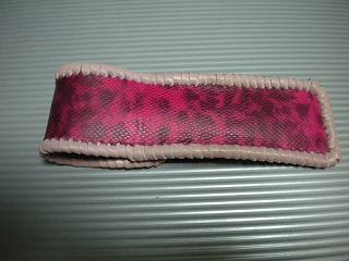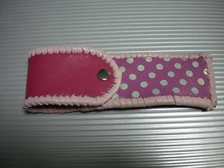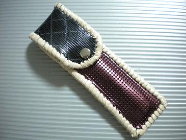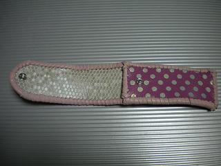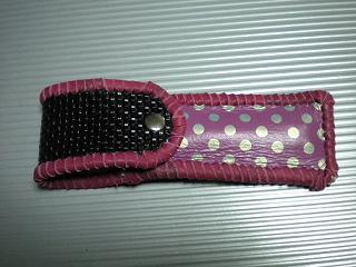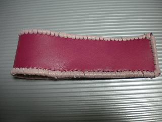 サイズは、縦17センチ×横5.5センチ。 15センチのペンが2本入ります。 表面の正面側は、パープルの入ったピンクレザーに、シルバーの水玉をプリント加工したレザーを使用。 表面の蓋から、後ろ側にかけては、編み込みデザインを型押した、ブラックレザーを使用しています。 ケース内側は、ライトピンクレザーを使用。 ケース周囲は、ピンクの入ったレッドレザーで、かがり仕上げをしました。 |
