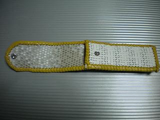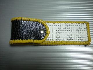 サイズは、縦17センチ×横5.5センチ。 15センチのペンが2本入ります。 表面の正面側は、立体感のある編み込みデザインを型押した、ホワイトレザーを使用。 表面の蓋から、後ろ側にかけては、ブラックベースに、シルバーの斑点デザインのレザーを使用。 ケース内側は、六角形をモチーフにした、型押しレザーを使用しました。 型押しは、ホワイトの凸縁取りに、中側が凹みで、淡いゴールドカラーのデザインになっています。 ケース周囲は、イエローレザーで、かがり仕上げをしました。 |