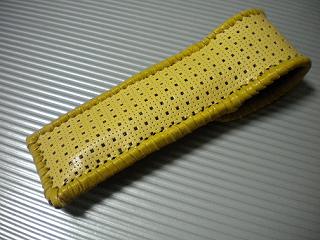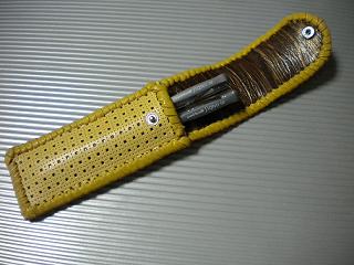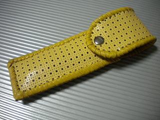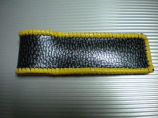 サイズは、縦17センチ×横5.5センチ。 15センチのペンが2本入ります。 表面は、イエローレザーに、大小の四角で構成されたデザインをパンチング加工したものを使用しました。 パンチングレザーの下地に、艶消しブラックレザーを使用して、貼り合わせています。 ケース内側は、ブラウンレザーに、ブラックとゴールドのウェーブデザインをプリント加工したものを使用しています。 ケース周囲は、イエローレザーで、かがり仕上げをしました。 |
