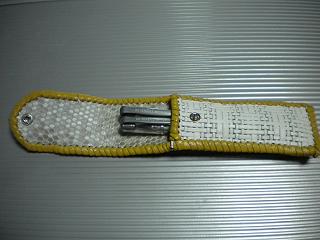 サイズは、縦17センチ×横5.5センチ。 15センチのペンが2本入ります。 表面の正面側は、立体感のある編み込みデザインを型押した、ホワイトレザーを使用。 表面の蓋から後ろ側にかけては、レモンイエローのレザーを使用しています。 内側は、和紙のような表面デザインのイエローレザーを使用。 ケース周囲は、ライトブラウンレザーで、かがり仕上げをしました。 |