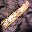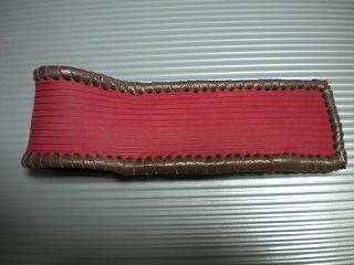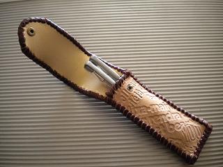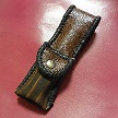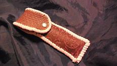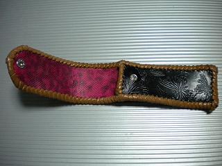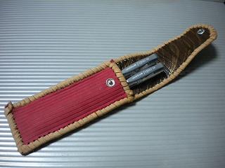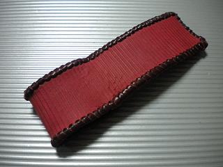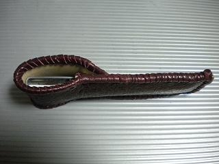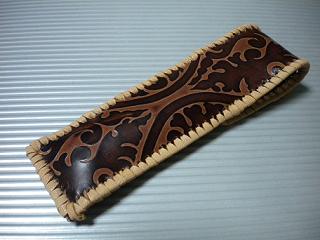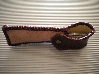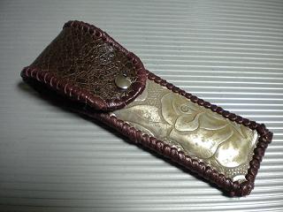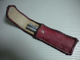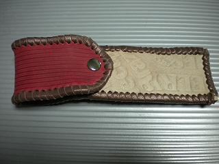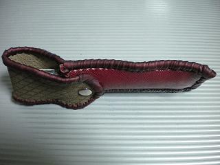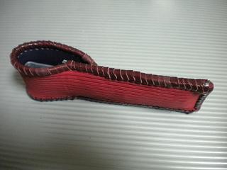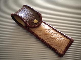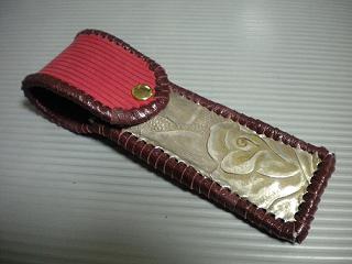 サイズは、縦17センチ×横5.5センチ。 15センチのペンが2本入ります。 表面の正面側は、バックスキン調のレッドレザーで、等間隔に溝を付けた型押しレザーを使用しています。 表面の蓋から後ろ側にかけては、ウエスタン調のリーフデザインレザーを使用しています。 ケース内側は、ブラウンレザーに、ブラックとゴールドのウェーブデザインをプリント加工したものを使用しています。 ケース周囲は、ホイートのレザーで、かがり仕上げをしました。 |