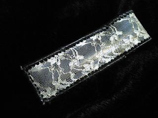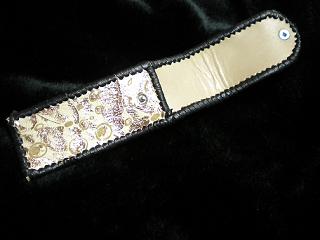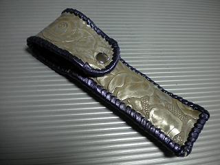 サイズは、縦17センチ×横5.5センチ。 15センチのペンが2本入ります。 表面の正面側は、蝶のデザインを型押した、ブラックレザーを使用しています。 表面の蓋から、後ろ側にかけては、メタリックブルーのレザーをベースに、花柄のレース生地を貼りつけ加工が施してあるレザーを使用しています。 内側は、ライトピンクレザーを使用しました。 ケース周囲は、ブラックレザーで、かがり仕上げをしています。 |
