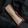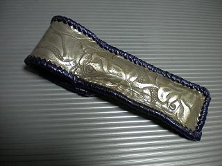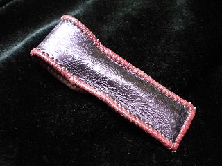 サイズは、縦17センチ×横5.5センチ。 15センチのペンが2本入ります。 表面の正面側は、薔薇のデザインを型押したレザーを使用。 カラーは、シルバーをぼかした色合いのものです。 表面の蓋から後ろ側にかけては、バックスキン調のレッドレザーで、等間隔に溝を付けた型押しレザーを使用しています。 ケース内側は、濃いパープルレザーを使用しています。 ケース周囲は、マルーンレザーで、かがり仕上げをしました。 |