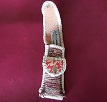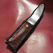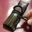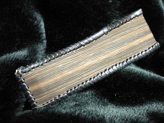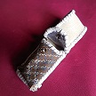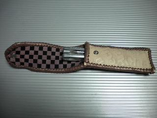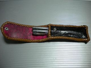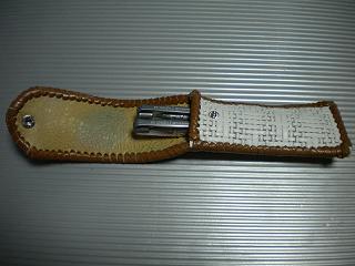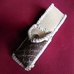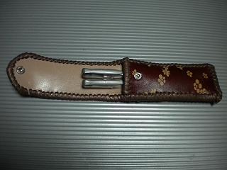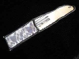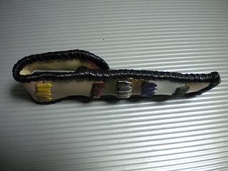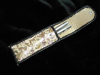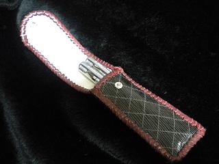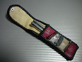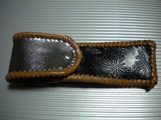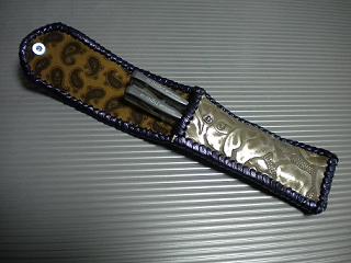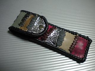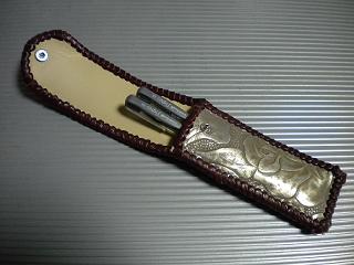サイズは、縦17センチ×横5.5センチ。 15センチのペンが2本入ります。 表面の正面側は、ブラックレザーに、蝶のデザインを型押したものを使用。 表面の蓋から、後ろ側にかけては、メタルシルバーのレザーを使用しました。 内側は、レッドスネークの型押しレザーを使用しています。 ケース周囲は、ライトブラウンレザーで、かがり仕上げをしています。 |