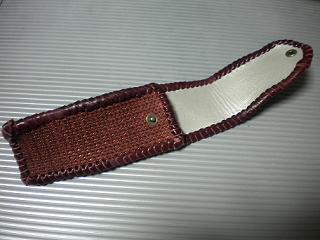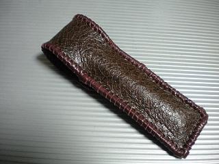サイズは、縦17センチ×横5.5センチ。 15センチのペンが2本入ります。 表面の正面側は、細かい編み込み型押しのカッパーレッドレザーを使用しています。 表面の蓋から、後ろ側にかけては、細かい編み込み型押しのカッパーブラウンレザーを使用しました。 内側は、パールホワイトレザーを使用。 周囲の部分は、マルーンレザーにて、かがり仕上げをしました。 |
