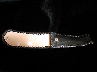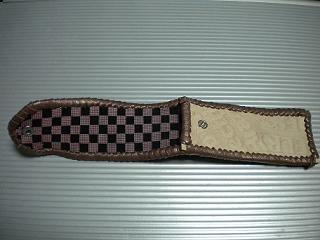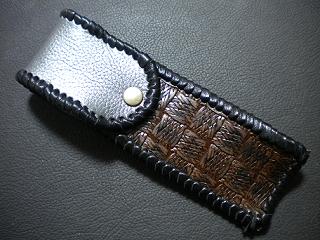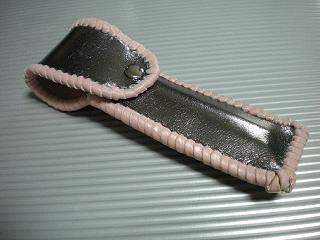 サイズは、縦17センチ×横5.5センチ。 15センチのペンが2本入ります。 表面の正面側は、大きめのチェック柄を型押したブラックレザーを使用。 表面の蓋から、後ろ側にかけては、ニス塗りの籐細工のようなデザイン型押し、ブラウンレザーを使用しました。 ケース内側は、ライトピンクレザーを使用。 ケース周囲は、オーシャンブルーのレザーで、かがり仕上をしました。 |