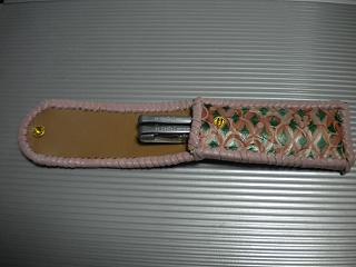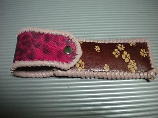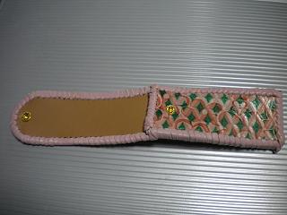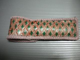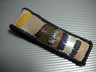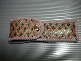 サイズは、縦17センチ×横5.5センチ。 15センチのペンが2本入ります。 表面は、クロス状に、型押したレザーに、オレンジカラーで、花柄を染めてあります。 その上には、グリーンの菱形を染めたデザインのレザーを使用しました。 内側は、キャメルブラウンレザーを使用。 ケースの周囲は、ピンクレザーで、かがり仕上げをしています。 |