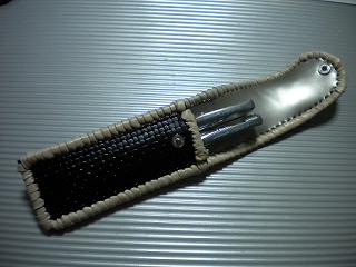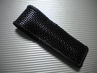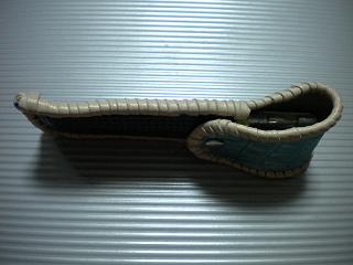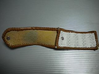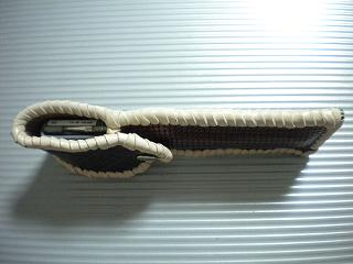 サイズは、縦17センチ×横5.5センチ。 15センチのペンが2本入ります。 表面の正面側は、ニス塗りの籐細工のような、編み込みデザイン型押しレザーを使用。 表面の蓋から、後ろ側にかけては、グレーメタリックレザーを使用。 ケース内側は、ベージュパンチングレザーを使用しました。 ケース周囲は、ブラックレザーを使用して、かがり仕上げをしました。 |